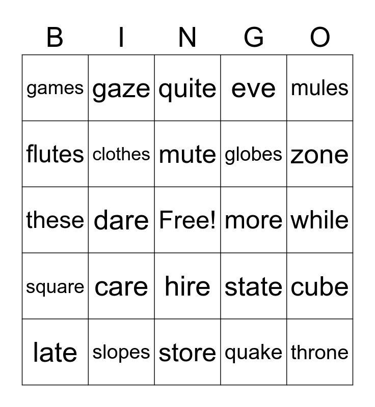 This bingo card has a free space and 29 words: late, plane, dare, chore, games, quite, clothes, care, more, slopes, while, throne, store, quake, zone, tune, hire, square, mules, these, state, stare, globes, flutes, eve, gaze, cube, mute and dune.