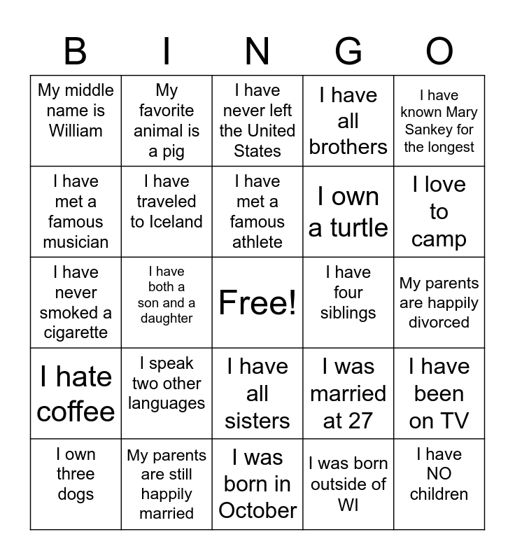 This bingo card has a free space and 29 words: I own three dogs, I have a green car, I have both a son and a daughter, My middle name is Marie, My middle name is William, I have never left the United States, I have traveled to Iceland, I speak two other languages, I have four siblings, My parents are still happily married, My parents are happily divorced, I have NO children, I was born in October, I was born outside of WI, I love to camp, I have never eaten a s'more, I have all sisters, I hate coffee, I have known Mary Sankey for the longest, I have never smoked a cigarette, I was married at 27, I have 3 cats, I own a turtle, I have met a famous musician, I have all brothers, My favorite animal is a pig, I have been on TV, I have met a famous athlete and I own a boat.
