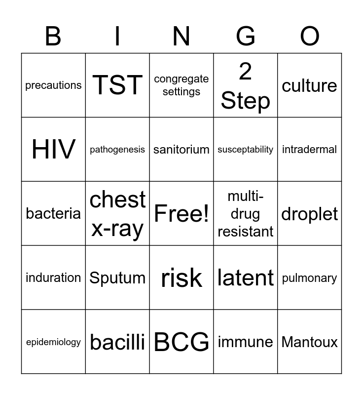 This bingo card has a free space and 24 words: Sputum, bacilli, sanitorium, epidemiology, culture, precautions, HIV, TST, multi-drug resistant, risk, susceptability, bacteria, latent, pulmonary, pathogenesis, immune, droplet, congregate settings, intradermal, chest x-ray, Mantoux, induration, 2 Step and BCG.