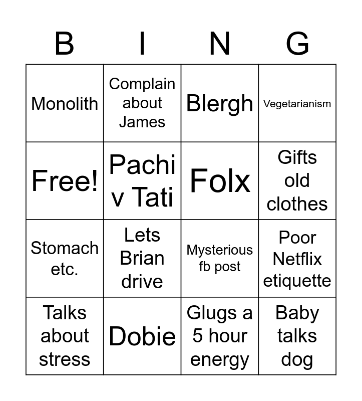 This bingo card has 16 words: Dobie, Poor Netflix etiquette, Blergh, Monolith, Stomach etc., Complain about James, Mysterious fb post, Glugs a 5 hour energy, Free!, Pachi v Tati, Talks about stress, Vegetarianism, Lets Brian drive, Gifts old clothes, Folx and Baby talks dog.