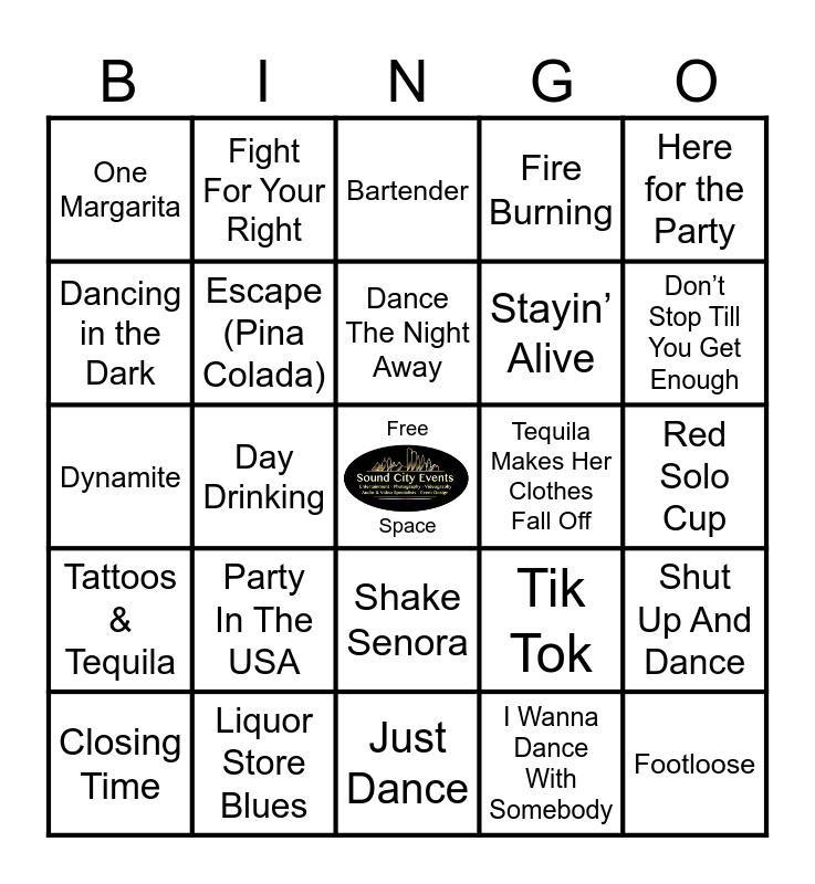 This bingo card has a free space and 74 words: A Little Party Never Killed Nobody, All Summer Long, Bartender, Beer for my Horses, Beer in Mexico, Bust A Move, Celebration, Cheers, Closing Time, Club Can’t Handle Me, Conga, Dance Again, Dance The Night Away, Dancing in the Dark, Dancing in the Street, Day Drinking, Don’t Stop The Music, Don’t Stop Till You Get Enough, Drunk on a Plane, Dynamite, Escape (Pina Colada), Fight For Your Right, Fire Burning, Fireball, Footloose, Friends in Low Places, Get The Party Started, Girls Just Wanna HaveFun, Groove is in the Heart, Have a Drink on Me, Here for the Party, Hey Ya, I Drink Alone, I Gotta Feeling, I Love This Bar, I Wanna Dance With Somebody, The Time of My Life, In Da Club, Into The Groove, It’s Five O’Clock Somewhere, Just Dance, Liquor Store Blues, Mr. Saxobeat, On The Floor, One Bourbon, One Scotch, One Beer, One Margarita, One More Time, Party In The USA, Party Rock Anthem, Party Train, Raise Your Glass, Red Red Wine, Red Solo Cup, Rock & Roll All Night, Rock The Casaba, Saturday Night, Shake Senora, Shots, Shout, Shut Up And Dance, Stayin’ Alive, Strike It Up, Tattoos & Tequila, Tequila, Tequila Makes Her Clothes Fall Off, The Humpty Dance, The Time, This is How We Do It, Tik Tok, Tubthumping, We Like To Party, Wiggle It, Wild Thing and Wine, Beer, Whiskey.
