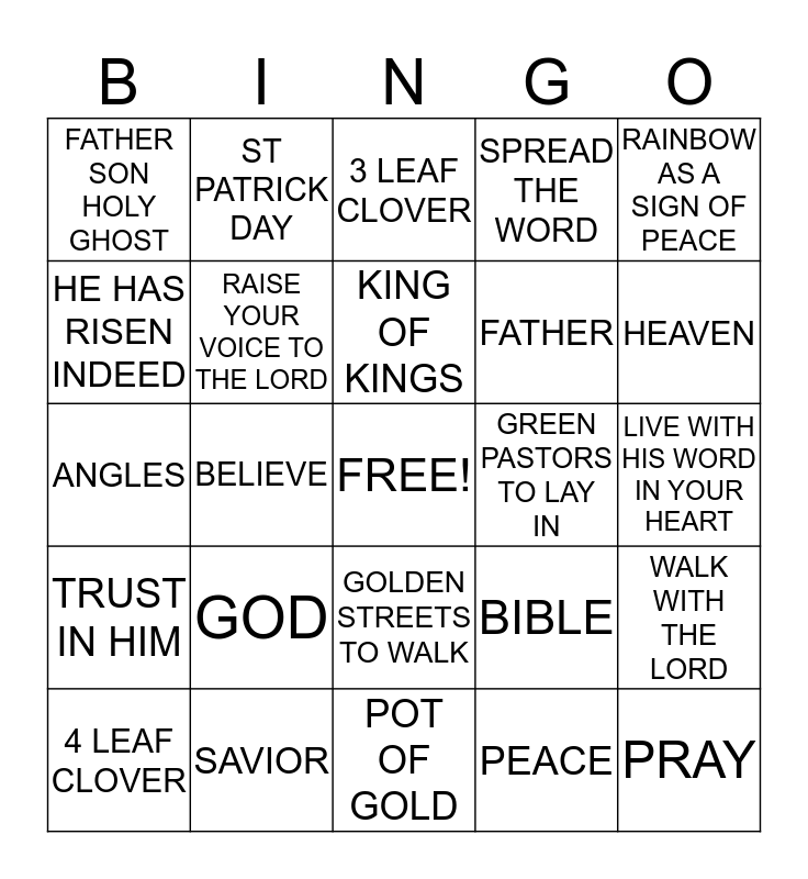 This bingo card has a free space and 24 words: GOD, SAVIOR, KING OF KINGS, 4 LEAF CLOVER, RAINBOW AS A SIGN OF PEACE, FATHER SON HOLY GHOST, HE HAS RISEN INDEED, ST PATRICK DAY, GREEN PASTORS TO LAY IN, GOLDEN STREETS TO WALK, FATHER, ANGLES, BIBLE, WALK WITH THE LORD, RAISE YOUR VOICE TO THE LORD, PEACE, LIVE WITH HIS WORD IN YOUR HEART, 3 LEAF CLOVER, HEAVEN, BELIEVE, PRAY, TRUST IN HIM, SPREAD THE WORD and POT OF GOLD.