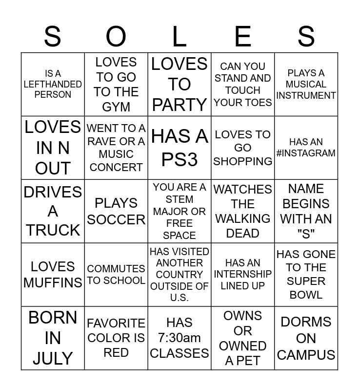 This bingo card has a free space and 24 words: COMMUTES TO SCHOOL, FAVORITE COLOR IS RED, HAS A PS3, BORN IN JULY, PLAYS A MUSICAL INSTRUMENT, IS A LEFTHANDED PERSON, LOVES IN N OUT, LOVES TO GO TO THE GYM, WATCHES THE WALKING DEAD, HAS VISITED ANOTHER COUNTRY OUTSIDE OF U.S., LOVES TO GO SHOPPING, DRIVES A TRUCK, HAS AN INTERNSHIP LINED UP, HAS GONE TO THE SUPER BOWL, WENT TO A RAVE OR A MUSIC CONCERT, OWNS OR OWNED A PET, NAME BEGINS WITH AN "S", LOVES TO PARTY, HAS AN #INSTAGRAM, PLAYS SOCCER, DORMS ON CAMPUS, LOVES MUFFINS, CAN YOU STAND AND TOUCH YOUR TOES and HAS 7:30am CLASSES.