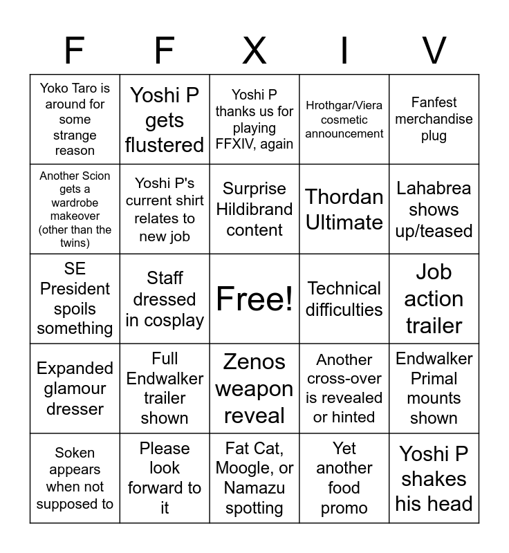 This bingo card has a free space and 45 words: Nobody correctly predicted the new melee class in our FC, Yoshi P shakes his head, Hummingways (moon rabbits) announced, Soken appears when not supposed to, New city is Sharlayan, Yet another food promo, Yoshi P thanks us for playing FFXIV, again, Mahjong content???, Fanfest merchandise plug, Please look forward to it, Hrothgar/Viera cosmetic announcement, Technical difficulties, Zenos weapon reveal, Full Endwalker trailer shown, We spot Natsuko Ishikawa, Fat Cat, Moogle, or Namazu spotting, Fedora Koji, SE President spoils something, Boring PS5 Beta information, Lahabrea shows up/teased, Yoshi P gets flustered, Foxclon speaks in English, New melee job doesn't use a scythe, Yoko Taro is around for some strange reason, We learn something new about Sage job, Job action trailer, Crafter/gatherer content, Limited job announcement, Another cross-over is revealed or hinted, Expanded glamour dresser, Koji getting yelled at, Endwalker Primal mounts shown, Private island content revealed!, Moon area revealed!, Blitzball is mentioned in some way (not in stream chat), Staff dressed in cosplay, Meracydia next 24 man, They don't mention the stat squish EVEN ONCE, Covid delay apology, Surprise Hildibrand content, Another Scion gets a wardrobe makeover (other than the twins), Thordan Ultimate, New melee job uses a scythe, Yoshi P's current shirt relates to new job and Yet another Ascian introduced.