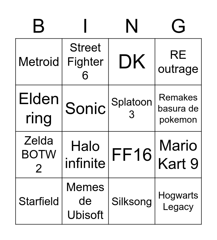This bingo card has 16 words: Memes de Ubisoft, Mario Kart 9, DK, Metroid, Zelda BOTW 2, Street Fighter 6, FF16, Silksong, Elden ring, Sonic, Starfield, RE outrage, Halo infinite, Remakes basura de pokemon, Splatoon 3 and Hogwarts Legacy.