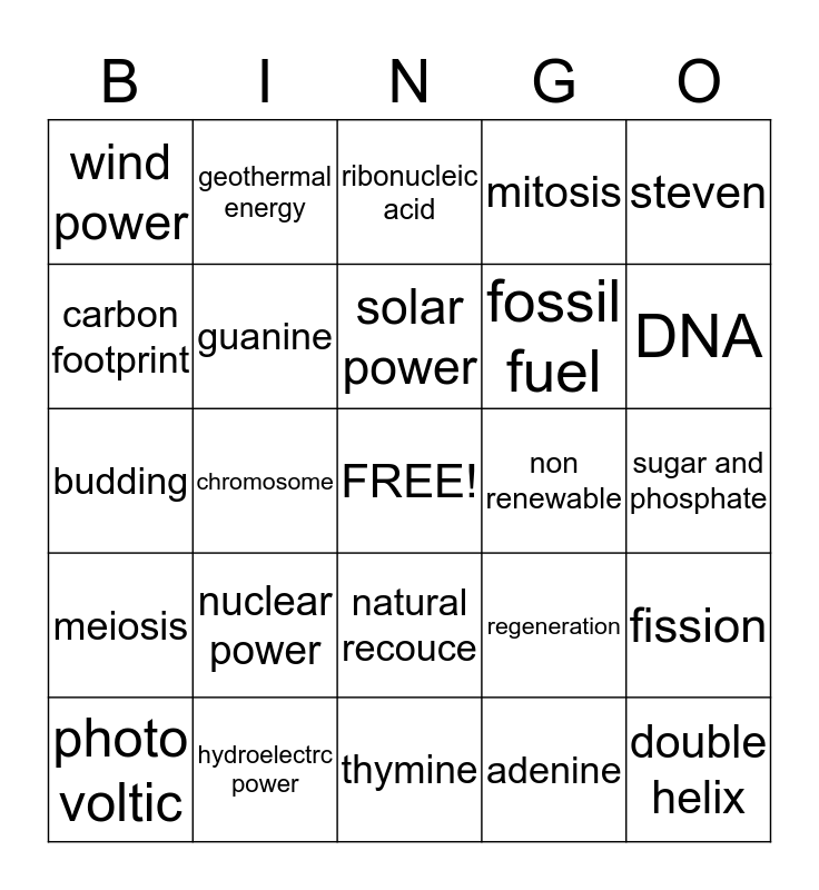This bingo card has a free space and 24 words: nuclear power, hydroelectrc power, solar power, photo voltic, steven, wind power, carbon footprint, geothermal energy, non renewable, natural recouce, fossil fuel, budding, regeneration, fission, guanine, adenine, sugar and phosphate, ribonucleic acid, DNA, chromosome, double helix, meiosis, mitosis and thymine.