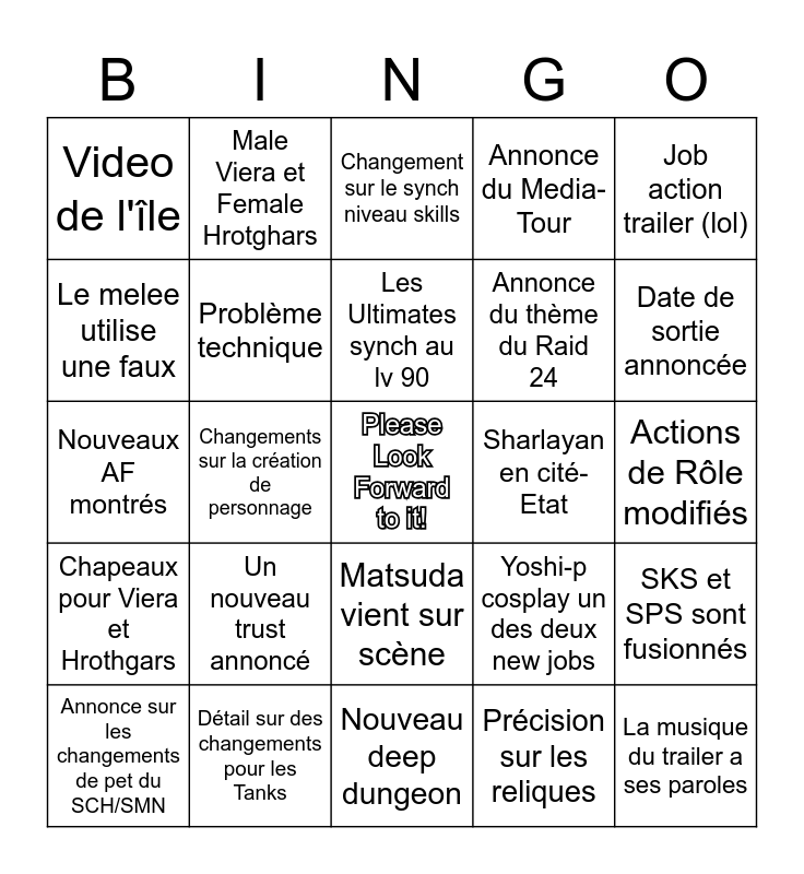 This bingo card has a free space and 24 words: Un nouveau trust annoncé, Détail sur des changements pour les Tanks, Les Ultimates synch au lv 90, Annonce sur les changements de pet du SCH/SMN, Job action trailer (lol), Video de l'île, Le melee utilise une faux, Male Viera et Female Hrotghars, Sharlayan en cité-Etat, Matsuda vient sur scène, Annonce du thème du Raid 24, Nouveaux AF montrés, Yoshi-p cosplay un des deux new jobs, SKS et SPS sont fusionnés, Problème technique, Précision sur les reliques, Actions de Rôle modifiés, Changement sur le synch niveau skills, Date de sortie annoncée, Changements sur la création de personnage, La musique du trailer a ses paroles, Chapeaux pour Viera et Hrothgars, Annonce du Media-Tour and Nouveau deep dungeon.