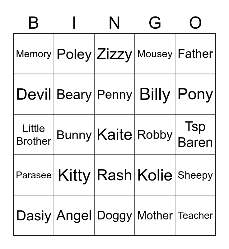 This bingo card has 25 words: Kitty, Doggy, Penny, Dasiy, Father, Memory, Devil, Poley, Robby, Rash, Billy, Little Brother, Kolie, Sheepy, Beary, Teacher, Tsp Baren, Zizzy, Pony, Bunny, Kaite, Angel, Parasee, Mousey and Mother.
