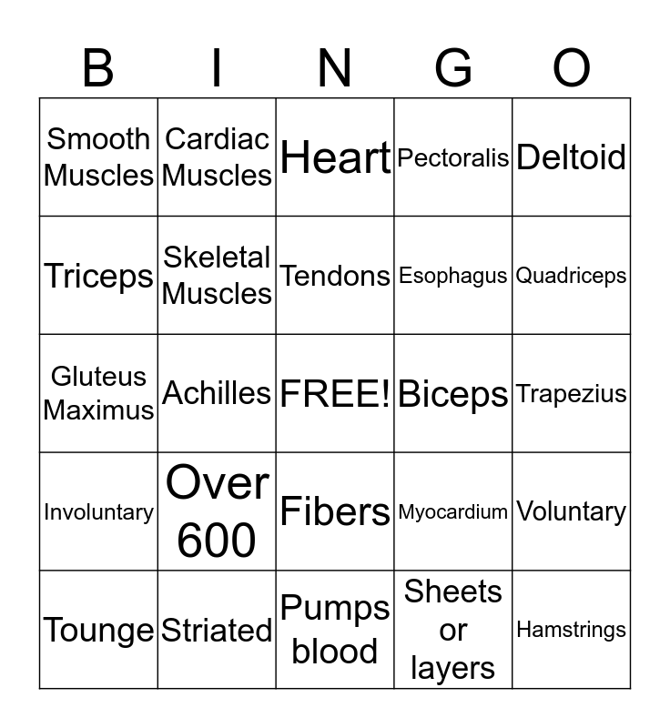 This bingo card has a free space and 24 words: Over 600, Striated, Tendons, Tounge, Deltoid, Smooth Muscles, Triceps, Cardiac Muscles, Biceps, Fibers, Esophagus, Gluteus Maximus, Myocardium, Voluntary, Skeletal Muscles, Sheets or layers, Trapezius, Heart, Quadriceps, Achilles, Hamstrings, Involuntary, Pectoralis and Pumps blood.