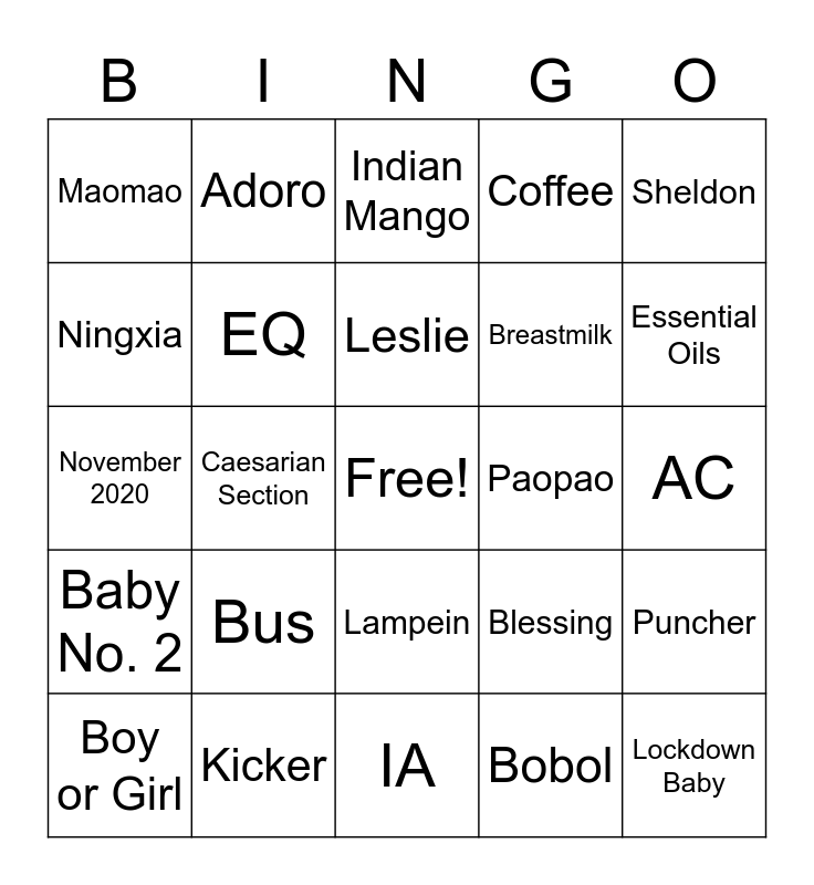 This bingo card has a free space and 35 words: Mama Sha, Papa Gigi, Kuya Gigi, EQ, Lampein, Coffee, Ningxia, 28 Weeks, Leslie, August 2021, November 2020, Sheldon, Qualimed, Totoy, Maomao, Paopao, Bobol, Caesarian Section, Baby No. 2, Lockdown Baby, Blessing, Boy or Girl, Puncher, Kicker, Indian Mango, Essential Oils, Anything, Chocolates, Breastmilk, AC, Raketera, IA, Bus, Adoro and 8 oz 1 shot.