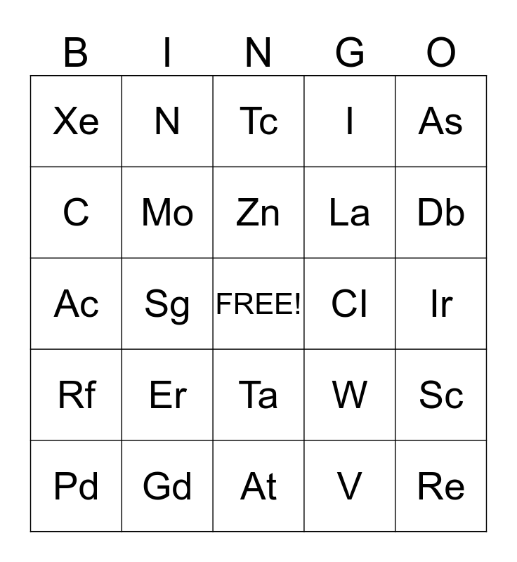 This bingo card has a free space and 24 words: Er, Gd, Zn, Pd, As, Xe, C, N, CI, Ta, La, Ac, W, Sc, Mo, V, Ir, Tc, Db, Sg, Re, Rf, I and At.