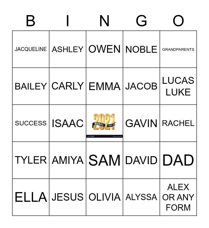 This bingo card has a free space and 53 words: ADAM, ALEX OR ANY FORM, ALLISON, ALYSSA, AMIYA, ANNA, ASHLEY, AUSTIN, BAILEY, BRANDON, CARLY, CHRISTIAN, DAD, DAVID, ELIZABETH, ELLA, EMMA, GAVIN, GRACE, GRANDPARENTS, ISAAC, ISABELLE, JACOB, JACQUELINE, JAMAL, JESUS, JORGE, KATHERINE, LEVI, LUCAS LUKE, LUIS, MASON, MATTHEW, MIA, MOM, NOAH, NOBLE, OLIVIA, OWEN, PAUL, PRINCIPAL, QUINTEN, RACHEL, RILEY, ROSIE, SAM, SARAH, SOPHIE, SUCCESS, TYLER, VIDAL, WILLIAM and ZACH.
