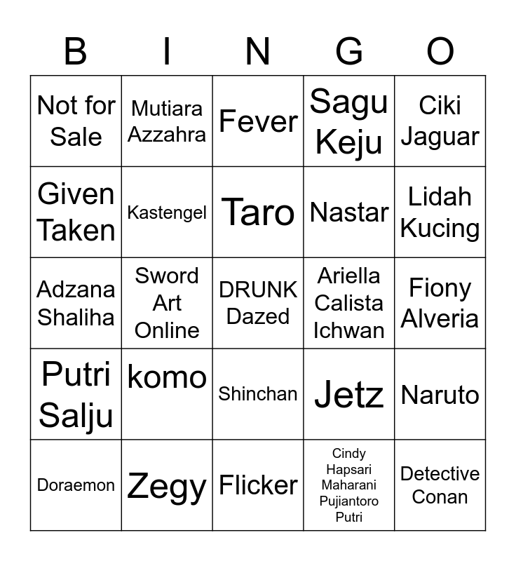 This bingo card has a free space and 24 words: komo, Zegy, Taro, Doraemon, Ciki Jaguar, Not for Sale, Given Taken, Mutiara Azzahra, Ariella Calista Ichwan, Shinchan, Nastar, Adzana Shaliha, Jetz, Naruto, Kastengel, Cindy Hapsari Maharani Pujiantoro Putri, Fiony Alveria, Fever, Lidah Kucing, Sword Art Online, Detective Conan, Putri Salju, Sagu Keju and Flicker.