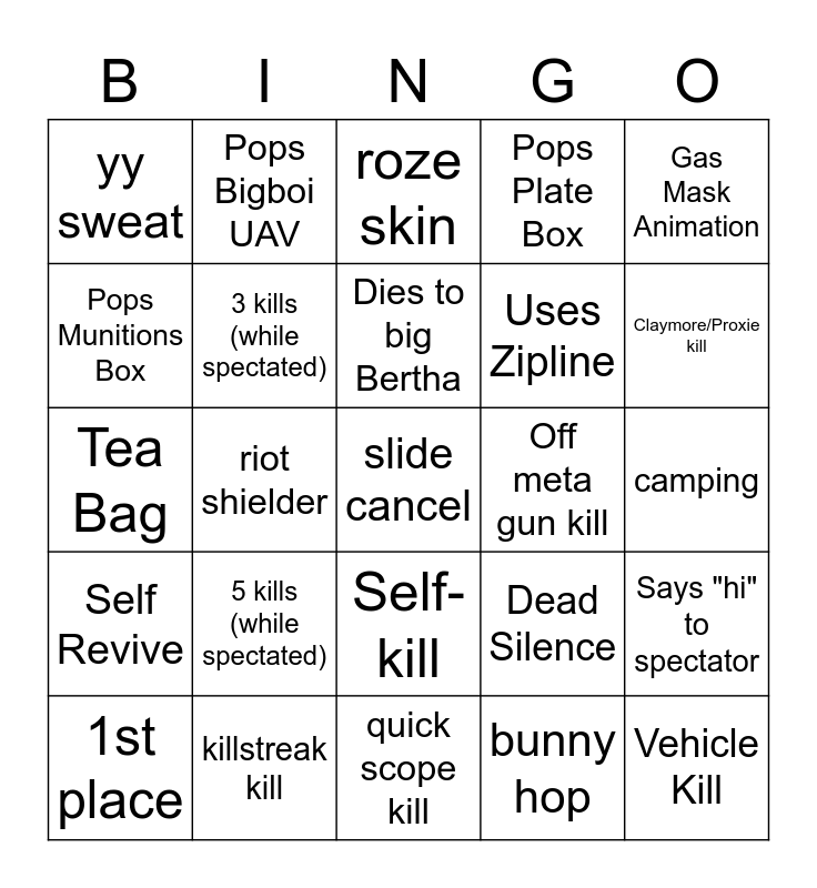 This bingo card has 29 words: 1st place, 2nd place, riot shielder, Vehicle Kill, yy sweat, roze skin, 3 kills (while spectated), 5 kills (while spectated), Off meta gun kill, killstreak kill, camping, slide cancel, quick scope kill, bunny hop, Claymore/Proxie kill, Launcher Kill, Self-kill, Self Revive, Gas Mask Animation, Tea Bag, Dead Silence, 10 kills (while spectated), Uses Zipline, Pops Munitions Box, Pops Plate Box, Pops Bigboi UAV, Says "hi" to spectator, Dies to big Bertha and Full Ego Chal.