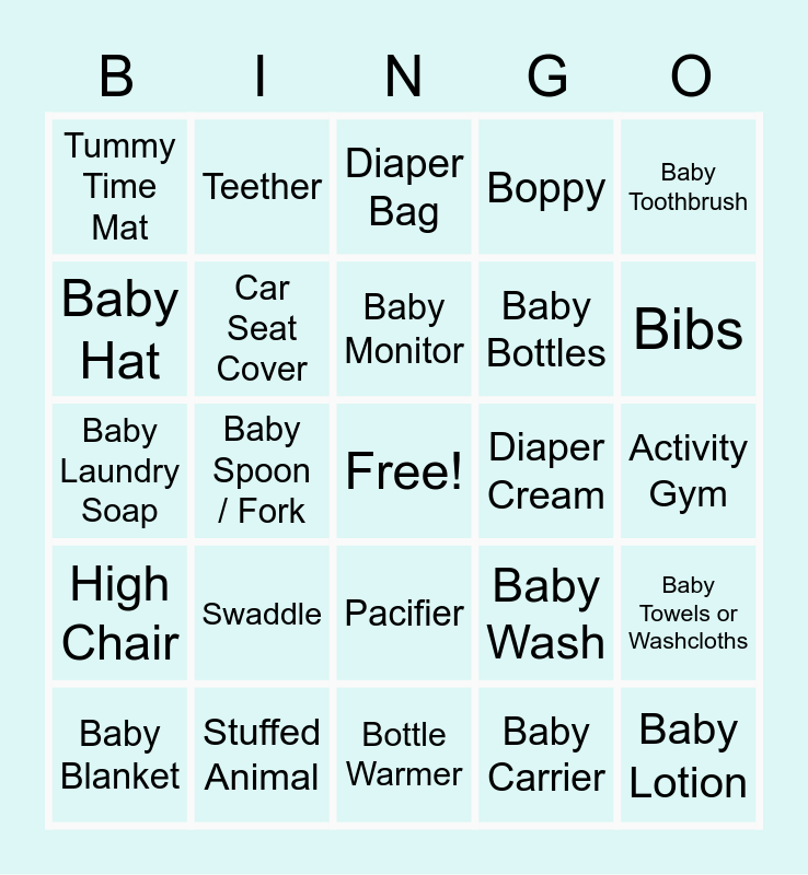 This bingo card has a free space and 38 words: Crib Sheet, Diaper Pail, Wipe Warmer, Diaper Cream, Baby Towels or Washcloths, High Chair, Baby Spoon / Fork, Burp Cloths, Baby Bottles, Bibs, Baby Hat, Car Seat Cover, Baby Carrier, Activity Gym, Tummy Time Mat, Swaddle, Bouncer, Boppy, Mobile, Baby Laundry Soap, Teether, Bottle Warmer, Baby Wash, Baby Lotion, Diapers, Wipes, Pacifier, Breastmilk Storage Bags, Onesie, Sound Machine, Baby Book, Baby Monitor, Humidifier, Baby Toothbrush, Baby Blanket, Stuffed Animal, Diaper Bag and Baby Hangers.