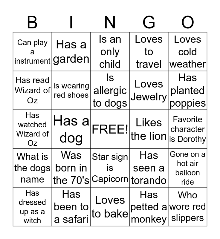 This bingo card has a free space and 24 words: Was born in the 70's, Has been to a safari, Is allergic to dogs, Has dressed up as a witch, Loves cold weather, Can play a instrument, Has read Wizard of Oz, Has a garden, Likes the lion, Star sign is Capicorn, Loves Jewelry, Has watched Wizard of Oz, Has seen a torando, Gone on a hot air balloon ride, Is wearing red shoes, Has petted a monkey, Favorite character is Dorothy, Is an only child, Has planted poppies, Has a dog, Who wore red slippers, What is the dogs name, Loves to travel and Loves to bake.