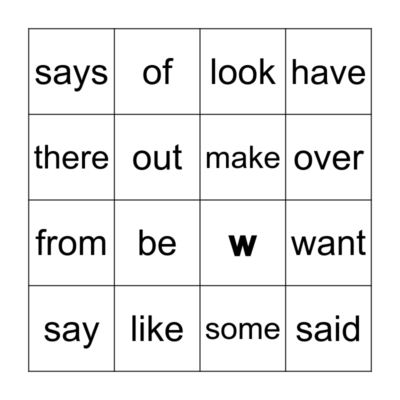 This bingo card has 21 words: like, home, of, name, some, make, says, look, w, over, from, have, said, her, out, come, say, be, there, want and for.