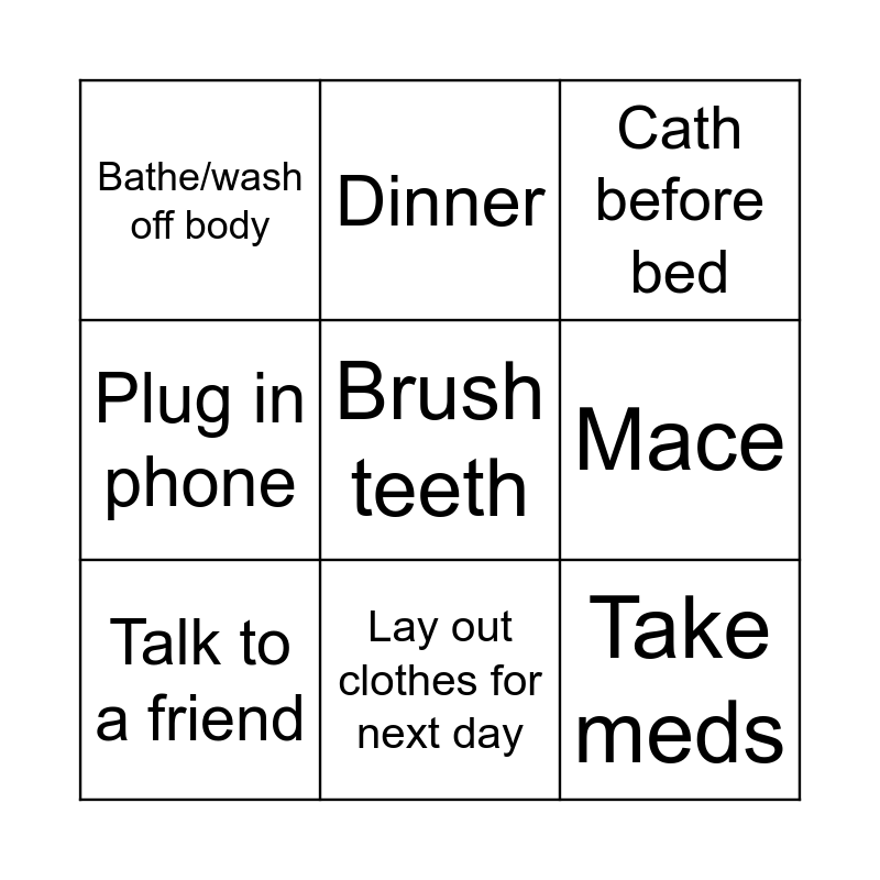 This bingo card has a free space and 8 words: Mace, Cath before bed, Dinner, Talk to a friend, Bathe/wash off body, Take meds, Plug in phone and Lay out clothes for next day.