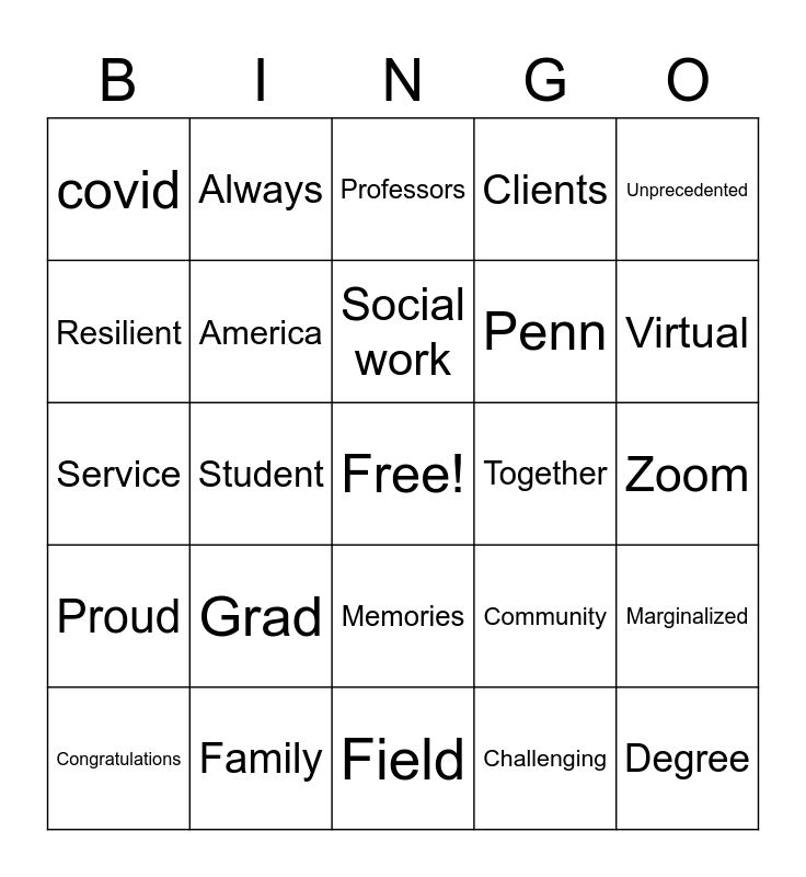 This bingo card has a free space and 24 words: Grad, Family, Social work, Congratulations, Unprecedented, covid, Resilient, Always, Together, Memories, Penn, Service, Community, Marginalized, America, Challenging, Zoom, Professors, Virtual, Student, Degree, Proud, Clients and Field.