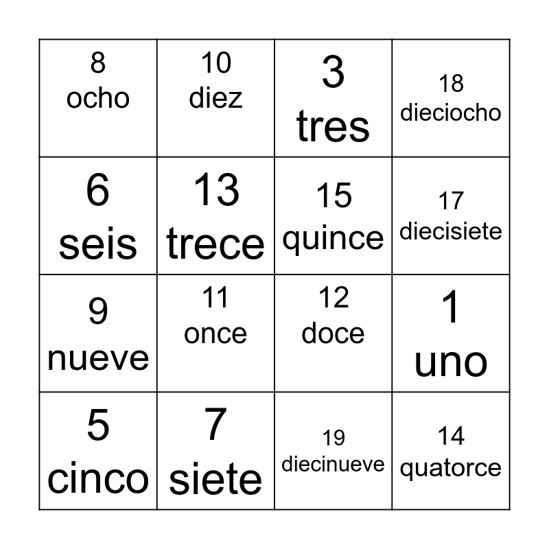 This bingo card has 20 words: 1 uno, 2 dos, 3 tres, 4 quatro, 5 cinco, 6 seis, 7 siete, 8 ocho, 9 nueve, 10 diez, 11 once, 12 doce, 13 trece, 14 quatorce, 15 quince, 16 dieciséis, 17 diecisiete, 18 dieciocho, 19 diecinueve and 20 veinte.