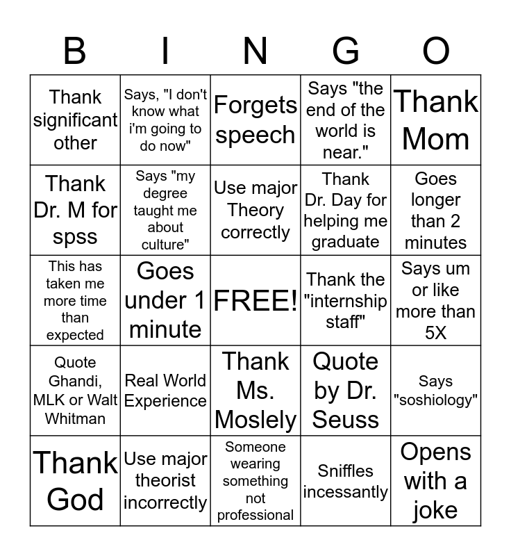 This bingo card has a free space and 24 words: Real World Experience, Use major theorist incorrectly, Use major Theory correctly, Thank God, Thank Mom, Thank significant other, Thank Dr. M for spss, Says, "I don't know what i'm going to do now", Thank the "internship staff", Thank Ms. Moslely, Thank Dr. Day for helping me graduate, This has taken me more time than expected, Quote by Dr. Seuss, Says "soshiology", Says "my degree taught me about culture", Sniffles incessantly, Says um or like more than 5X, Forgets speech, Goes longer than 2 minutes, Goes under 1 minute, Opens with a joke, Quote Ghandi, MLK or Walt Whitman, Says "the end of the world is near." and Someone wearing something not professional.