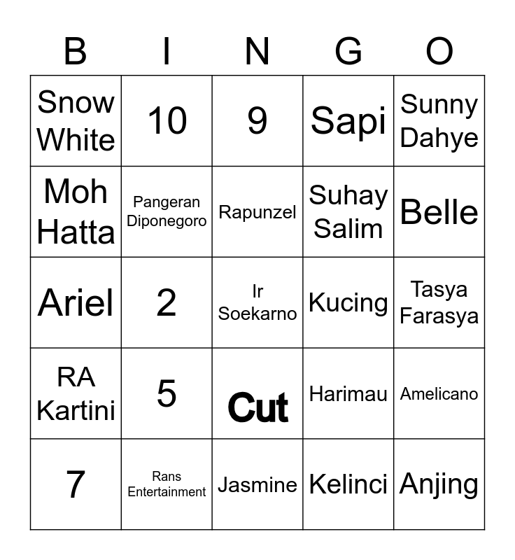 This bingo card has a free space and 24 words: 5, Rans Entertainment, Rapunzel, 7, Sunny Dahye, Snow White, Moh Hatta, 10, Kucing, Cut, Suhay Salim, Ariel, Harimau, Amelicano, Pangeran Diponegoro, Kelinci, Tasya Farasya, 9, Belle, 2, Anjing, RA Kartini, Sapi and Jasmine.