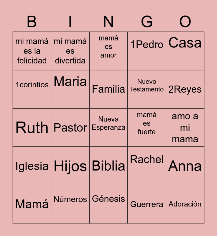 This bingo card has a free space and 24 words: Mamá, Hijos, Familia, Guerrera, Casa, mi mamá es la felicidad, mi mamá es divertida, mamá es amor, mamá es fuerte, amo a mi mama, Ruth, Maria, Rachel, Anna, 1corintios, Números, Génesis, 1Pedro, 2Reyes, Iglesia, Pastor, Biblia, Nuevo Testamento and Adoración.