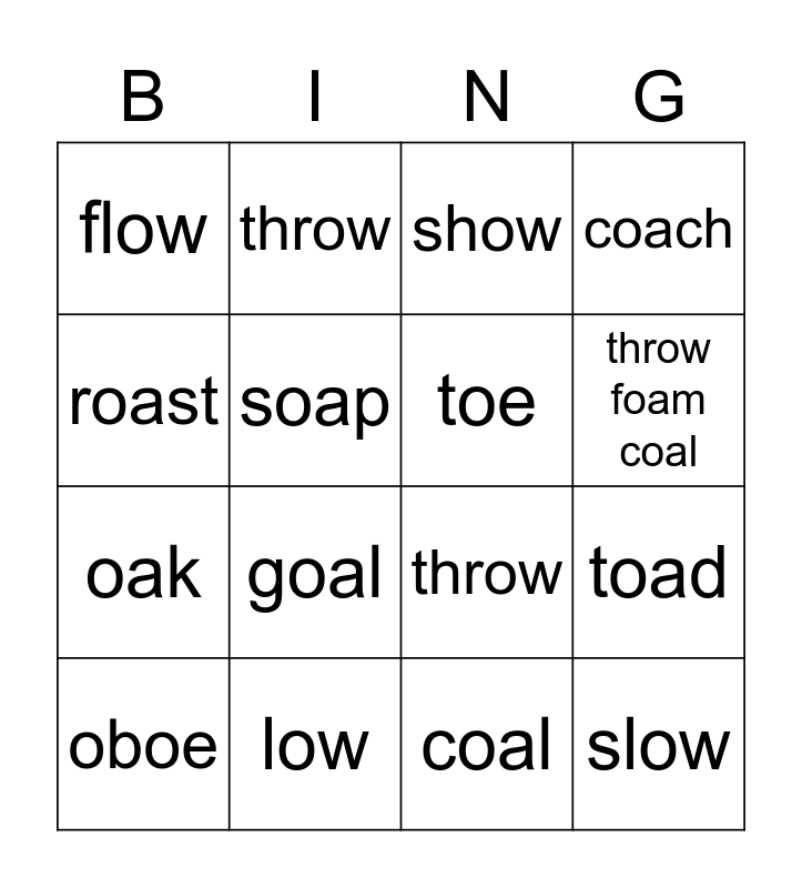This bingo card has 30 words: foe, hoe, toad, soak, flow, show, toe, low, low, foam, coal, oboe, road, snow, goal, row, snow, slow, hoe, roast, throw, toe, throw, oak, soap, coach, snow, toe, throw foam coal and soak.
