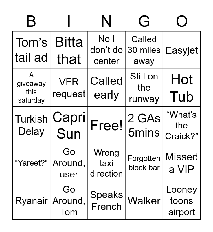 This bingo card has a free space and 24 words: Go Around, user, Go Around, Tom, Called early, Ryanair, Easyjet, Tom’s tail ad, A giveaway this saturday, Bitta that, 2 GAs 5mins, Wrong taxi direction, Still on the runway, Turkish Delay, Forgotten block bar, Missed a VIP, VFR request, Walker, “What’s the Craick?”, No I don’t do center, Hot Tub, Capri Sun, Looney toons airport, “Yareet?”, Called 30 miles away and Speaks French.