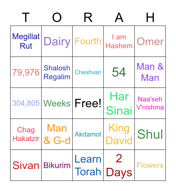 This bingo card has a free space and 29 words: Sivan, Fifty, Weeks, Eat Meat, Megillat Rut, Fourth, Shalosh Regalim, Man & G-d, Har Sinai, Bikurim, Naa'seh V'nishma, Flowers, Learn Torah, 2 Days, Man & Man, Lag B'aomer, Akdamot, Chag Hakatzir, Omer, 304,805, King David, Cheesecake, 54, 79,976, I am Hashem, Dairy, Shul, Cheshvan and 40 Years.