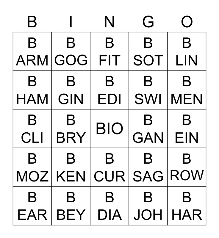 This bingo card has a free space and 29 words: B EAR, B KIN, B BRY, B FRA, B ARM, B FIT, B GIN, B KEN, B GAN, B BEY, B EIN, B HAR, B DIA, B JOH, B MEN, B ELL, B CUR, B MOZ, B LIN, B CLI, B SAG, B KEL, B SWI, B HAM, B SOT, B GOG, B ROW, B EDI and B YOU.