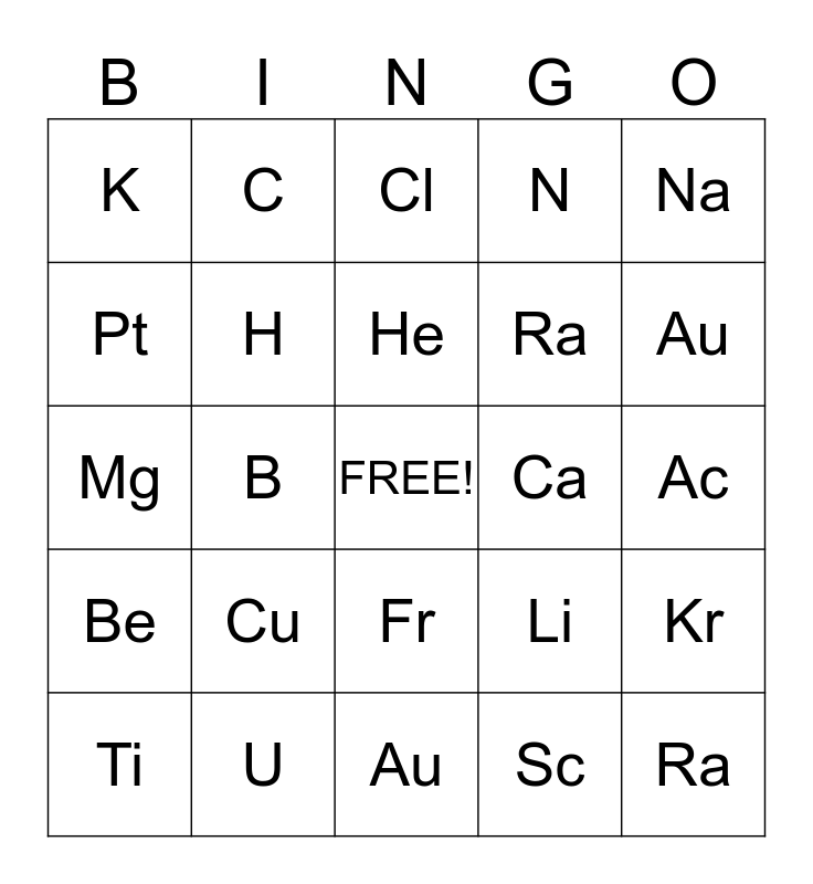 This bingo card has a free space and 24 words: Cu, U, He, Ti, Na, K, Pt, C, Ca, Fr, Ra, Mg, Li, Kr, H, Sc, Ac, Cl, Au, B, Ra, Be, N and Au.