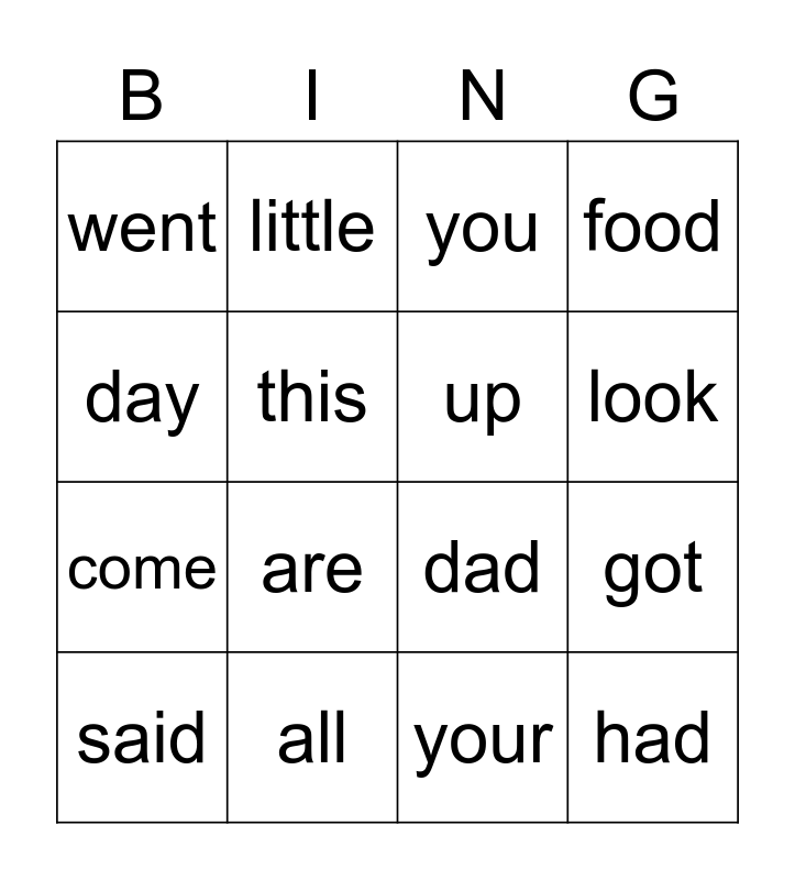 This bingo card has 24 words: I, see, look, come, day, went, this, little, all, school, come, dad, mom, he, up, what, your, you, are, got, said, had, food and make.