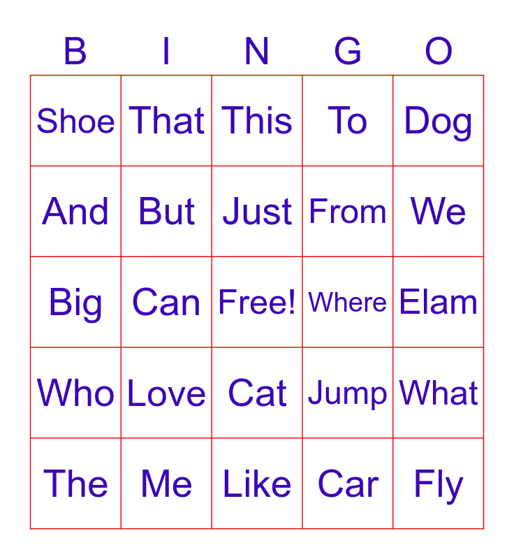 This bingo card has a free space and 27 words: Jump, With, From, Like, And, This, That, Who, Where, What, Big, To, The, Me, We, Pizza, But, Just, Love, Shoe, Elam, Car, Can, Fly, Cat, Dog and Plane.