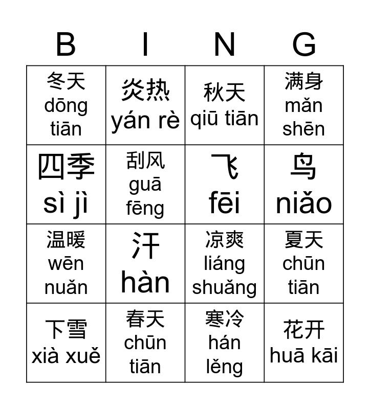 This bingo card has 16 words: 春天 chūn tiān, 夏天 chūn tiān, 秋天 qiū tiān, 冬天 dōng tiān, 温暖 wēn nuǎn, 炎热 yán rè, 凉爽 liáng shuǎng, 寒冷 hán lěng, 四季 sì jì, 刮风 guā fēng, 下雪 xià xuě, 满身 mǎn shēn, 汗 hàn, 鸟 niǎo, 飞 fēi and 花开 huā kāi.
