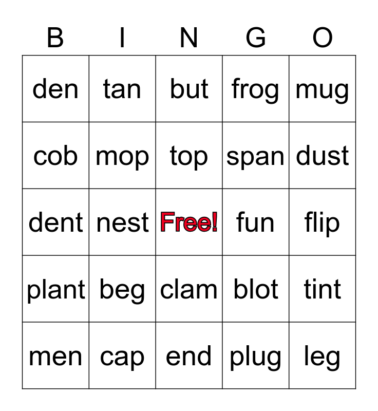 This bingo card has a free space and 24 words: beg, cap, top, men, mug, den, cob, tan, fun, clam, span, dent, blot, tint, mop, plug, flip, but, dust, nest, leg, plant, frog and end.