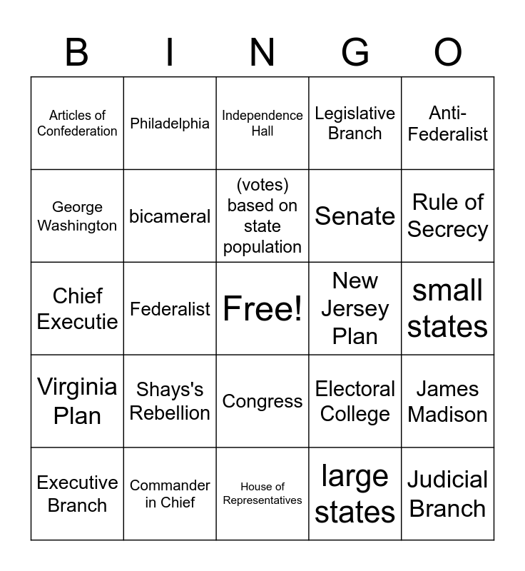 This bingo card has a free space and 27 words: Electoral College, Nine, Senate, House of Representatives, George Washington, Independence Hall, Philadelphia, Virginia Plan, New Jersey Plan, James Madison, Chief Executie, Legislative Branch, Executive Branch, Commander in Chief, Rule of Secrecy, ratification, bicameral, (votes) based on state population, Shays's Rebellion, Articles of Confederation, small states, large states, Federalist, Judicial Branch, Congress, Anti-Federalist and Constitution.