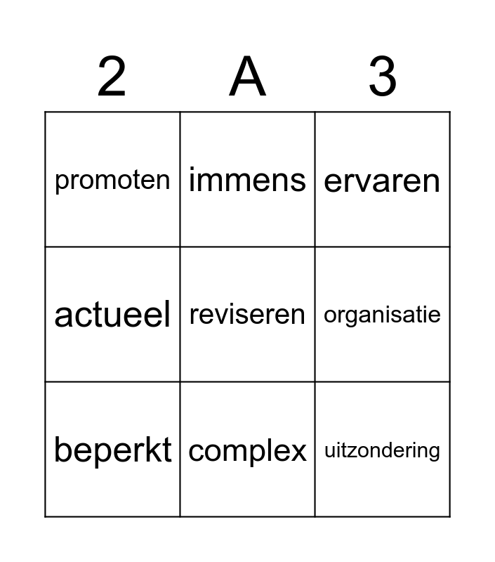 This bingo card has 15 words: zich baseren op, behandelen, ervaren, promoten, complex, reviseren, vernemen, verschaffen, organisatie, uitzondering, voorwaarde, actueel, beperkt, immens and zogenaamd.