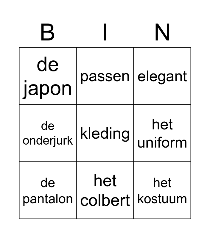 This bingo card has a free space and 10 words: het colbert, elegant, de japon, het kostuum, de onderjurk, de pantalon, passen, tweedehands, het uniform and versleten.