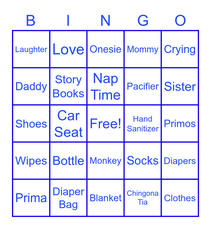 This bingo card has a free space and 24 words: Bottle, Diaper Bag, Nap Time, Prima, Crying, Laughter, Daddy, Love, Hand Sanitizer, Monkey, Pacifier, Shoes, Socks, Diapers, Story Books, Chingona Tia, Primos, Onesie, Sister, Car Seat, Clothes, Wipes, Mommy and Blanket.