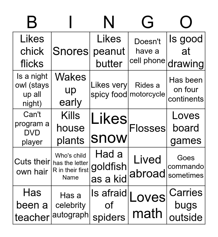 This bingo card has 25 words: Who's child has the letter R in their first Name, Is afraid of spiders, Likes very spicy food, Has been a teacher, Is good at drawing, Likes chick flicks, Is a night owl (stays up all night), Snores, Flosses, Had a goldfish as a kid, Rides a motorcycle, Can't program a DVD player, Lived abroad, Goes commando sometimes, Wakes up early, Carries bugs outside, Loves board games, Likes peanut butter, Has been on four continents, Kills house plants, Likes snow, Has a celebrity autograph, Cuts their own hair, Doesn't have a cell phone and Loves math.