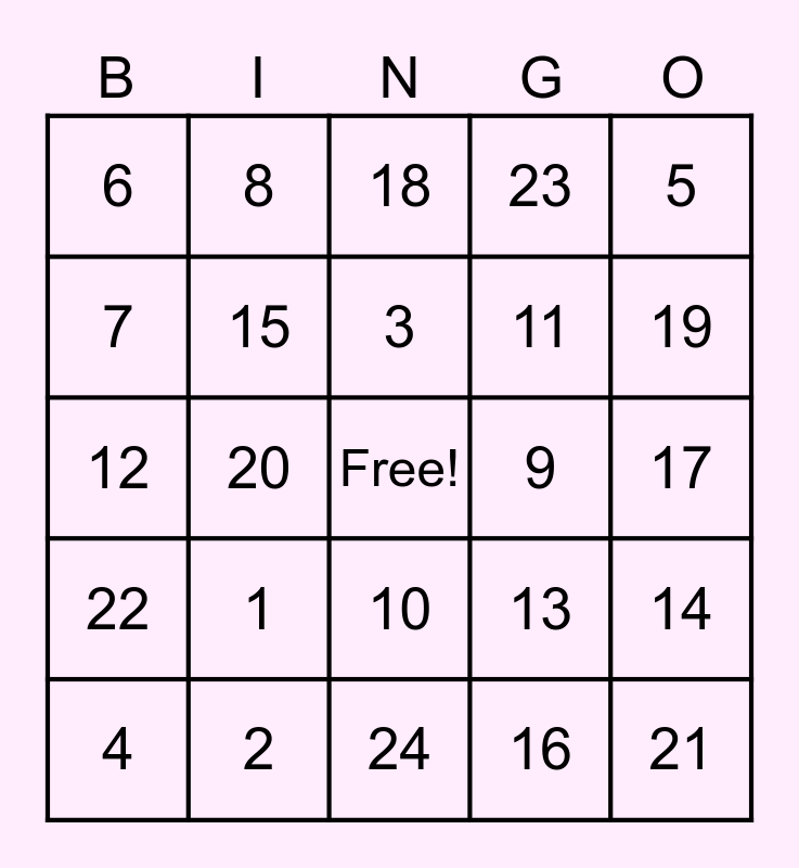 This bingo card has a free space and 24 words: 1, 2, 3, 4, 5, 6, 7, 8, 9, 10, 11, 12, 13, 14, 15, 16, 17, 18, 19, 20, 21, 22, 23 and 24.