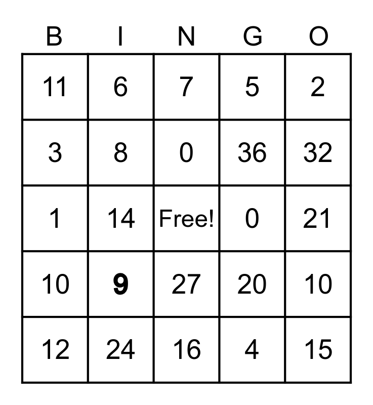 This bingo card has a free space and 24 words: 9, 24, 0, 12, 2, 11, 3, 6, 0, 27, 36, 1, 20, 10, 8, 4, 21, 7, 32, 14, 15, 10, 5 and 16.