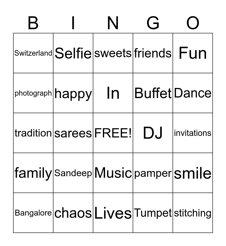 This bingo card has a free space and 25 words: Sandeep, Lives, In, Bangalore, Fun, Switzerland, photograph, Selfie, DJ, Music, Buffet, tradition, pamper, smile, happy, relatives, invitations, sweets, Dance, sarees, stitching, chaos, family, friends and Tumpet.