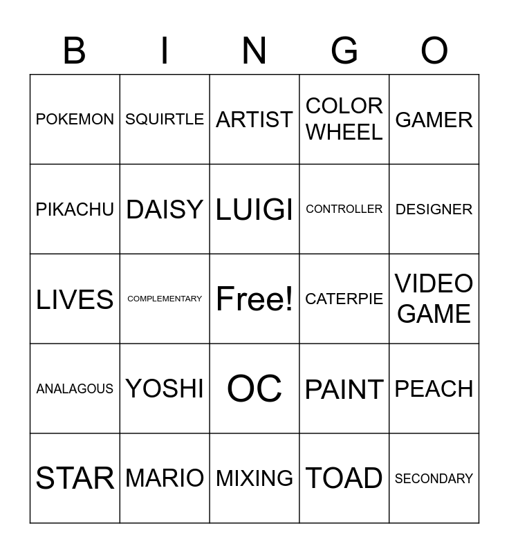 This bingo card has a free space and 24 words: YOSHI, MARIO, LUIGI, STAR, GAMER, POKEMON, PIKACHU, SQUIRTLE, CATERPIE, OC, CONTROLLER, LIVES, PAINT, PEACH, DAISY, TOAD, VIDEO GAME, ARTIST, DESIGNER, COMPLEMENTARY, SECONDARY, ANALAGOUS, COLOR WHEEL and MIXING.