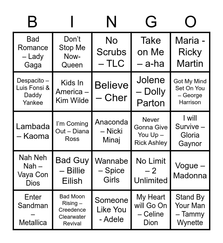 This bingo card has 59 words: Free!, Bad Moon Rising – Creedence Clearwater Revival, Rasputin – Boney M., Nah Neh Nah – Vaya Con Dios, My Heart will Go On – Celine Dion, Can’t Get You Out Of My Mind – Kylie Minogue, Kids In America – Kim Wilde, No One Knows – Queens of the Stone Age, Jolene – Dolly Parton, Ace of Spades – Motörhead, Take on Me – a-ha, Edge of Seventeen – Stevie Nicks, Despacito – Luis Fonsi & Daddy Yankee, Girls Just Want To Have Fun – Cindy Lauper, Everybody (Backstreet’s Back) – Backstreet Boys, Bad Romance – Lady Gaga, Anaconda – Nicki Minaj, Maria - Ricky Martin, Smells Like Teen Spirit – Nirvana, Believe – Cher, Never Gonna Give You Up – Rick Ashley, No Scrubs – TLC, Enter Sandman – Metallica, Vogue – Madonna, I’m Every Woman – Chaka Khan, Danger! High Voltage – Electric Six, Shake It Off – Taylor Swift, Blitzkrieg Bop – Ramones, Got My Mind Set On You – George Harrison, Goodbye Horses – Q Lazzarus, Bohemian Rhapsody – Queen, Ik Vind Je Lekker - De Kraaien, Total Eclipse of the Heart – Bonnie Tyler, I love it – Icona Pop ft. Charli XCX, Don’t Stop Me Now- Queen, Super Freak – Rick James, Dancing Queen – ABBA, I’m Coming Out – Diana Ross, Boom, Boom, Boom, Boom!! – Venga Boys, Lambada – Kaoma, One Way or Another – Blondie, Bad Guy – Billie Eilish, I will Survive – Gloria Gaynor, Happy – Pharrel Williams, …Baby One More Time – Britney Spears, Temperature – Sean Paul, Try Again – Aaliyah, Mambo nr 5 – Lou Bega, Wannabe – Spice Girls, Someone Like You - Adele, Murder On The Dancefloor – Sophie Ellis-Baxtor, That’s Not My Name – The Ting Things, Venus – Shocking Blue, Hey Ya! – Outkast, Livin’ On A Prayer – Bon Jovi, No Limit – 2 Unlimited, Baggy Trousers – Madness, Stand By Your Man – Tammy Wynette and Drunken Lullabies – Flogging Molly.