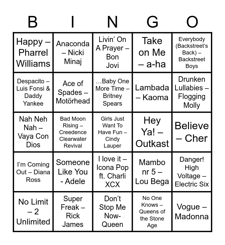 This bingo card has 59 words: Free!, Super Freak – Rick James, Dancing Queen – ABBA, I’m Coming Out – Diana Ross, No One Knows – Queens of the Stone Age, Jolene – Dolly Parton, Ace of Spades – Motörhead, Boom, Boom, Boom, Boom!! – Venga Boys, Lambada – Kaoma, One Way or Another – Blondie, Take on Me – a-ha, Edge of Seventeen – Stevie Nicks, Despacito – Luis Fonsi & Daddy Yankee, Bad Guy – Billie Eilish, I will Survive – Gloria Gaynor, Happy – Pharrel Williams, Girls Just Want To Have Fun – Cindy Lauper, Everybody (Backstreet’s Back) – Backstreet Boys, Bad Romance – Lady Gaga, …Baby One More Time – Britney Spears, Hey Ya! – Outkast, Livin’ On A Prayer – Bon Jovi, No Limit – 2 Unlimited, Danger! High Voltage – Electric Six, Shake It Off – Taylor Swift, Blitzkrieg Bop – Ramones, Baggy Trousers – Madness, Stand By Your Man – Tammy Wynette, Drunken Lullabies – Flogging Molly, Got My Mind Set On You – George Harrison, Goodbye Horses – Q Lazzarus, Bohemian Rhapsody – Queen, Ik Vind Je Lekker - De Kraaien, Try Again – Aaliyah, Anaconda – Nicki Minaj, Maria - Ricky Martin, Smells Like Teen Spirit – Nirvana, Bad Moon Rising – Creedence Clearwater Revival, Rasputin – Boney M., Nah Neh Nah – Vaya Con Dios, Wannabe – Spice Girls, Someone Like You - Adele, Believe – Cher, No Scrubs – TLC, Murder On The Dancefloor – Sophie Ellis-Baxtor, That’s Not My Name – The Ting Things, Venus – Shocking Blue, Enter Sandman – Metallica, I love it – Icona Pop ft. Charli XCX, Don’t Stop Me Now- Queen, My Heart will Go On – Celine Dion, Can’t Get You Out Of My Mind – Kylie Minogue, Kids In America – Kim Wilde, Total Eclipse of the Heart – Bonnie Tyler, Temperature – Sean Paul, Mambo nr 5 – Lou Bega, Never Gonna Give You Up – Rick Ashley, Vogue – Madonna and I’m Every Woman – Chaka Khan.
