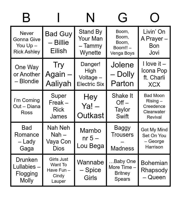 This bingo card has 59 words: Free!, Girls Just Want To Have Fun – Cindy Lauper, Everybody (Backstreet’s Back) – Backstreet Boys, Bad Romance – Lady Gaga, …Baby One More Time – Britney Spears, Temperature – Sean Paul, Try Again – Aaliyah, No One Knows – Queens of the Stone Age, Jolene – Dolly Parton, Ace of Spades – Motörhead, Boom, Boom, Boom, Boom!! – Venga Boys, Lambada – Kaoma, One Way or Another – Blondie, Someone Like You - Adele, Believe – Cher, Never Gonna Give You Up – Rick Ashley, Hey Ya! – Outkast, Livin’ On A Prayer – Bon Jovi, No Limit – 2 Unlimited, Danger! High Voltage – Electric Six, Shake It Off – Taylor Swift, Stand By Your Man – Tammy Wynette, Drunken Lullabies – Flogging Molly, Got My Mind Set On You – George Harrison, That’s Not My Name – The Ting Things, Venus – Shocking Blue, Enter Sandman – Metallica, Total Eclipse of the Heart – Bonnie Tyler, I love it – Icona Pop ft. Charli XCX, Don’t Stop Me Now- Queen, My Heart will Go On – Celine Dion, Can’t Get You Out Of My Mind – Kylie Minogue, Edge of Seventeen – Stevie Nicks, Despacito – Luis Fonsi & Daddy Yankee, Bad Guy – Billie Eilish, I will Survive – Gloria Gaynor, Kids In America – Kim Wilde, Super Freak – Rick James, Dancing Queen – ABBA, I’m Coming Out – Diana Ross, Rasputin – Boney M., Nah Neh Nah – Vaya Con Dios, Bad Moon Rising – Creedence Clearwater Revival, Take on Me – a-ha, Happy – Pharrel Williams, Anaconda – Nicki Minaj, Maria - Ricky Martin, Smells Like Teen Spirit – Nirvana, Mambo nr 5 – Lou Bega, Wannabe – Spice Girls, No Scrubs – TLC, Murder On The Dancefloor – Sophie Ellis-Baxtor, Vogue – Madonna, I’m Every Woman – Chaka Khan, Blitzkrieg Bop – Ramones, Baggy Trousers – Madness, Goodbye Horses – Q Lazzarus, Bohemian Rhapsody – Queen and Ik Vind Je Lekker - De Kraaien.