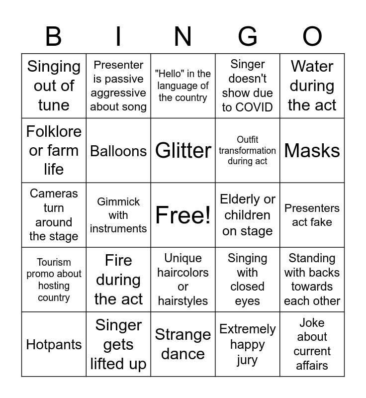 This bingo card has a free space and 39 words: Singer winks, "Are you ready...", Boyband, Balloons, Hotpants, Unique haircolors or hairstyles, Glitter, Talking through each other, Water during the act, Tourism promo about hosting country, Gimmick with instruments, Singer doesn't show due to COVID, Joke about current affairs, Presenters act fake, Elderly or children on stage, Fire during the act, Smoke machine, Singing out of tune, Presenter talks over sensitive music, Singing with closed eyes, Folklore or farm life, Strange dance, Outfit transformation during act, Masks, Broken English, Panting while singing, Singer looks like a scared animal, Classic or unique instruments, Reference to old eurovisions, Presenter is passive aggressive about song, Political statement, Extreme makeup, "Hello" in the language of the country, Singer gets lifted up, Extremely happy jury, Drag, Standing with backs towards each other, Cameras turn around the stage and Country favoritism.