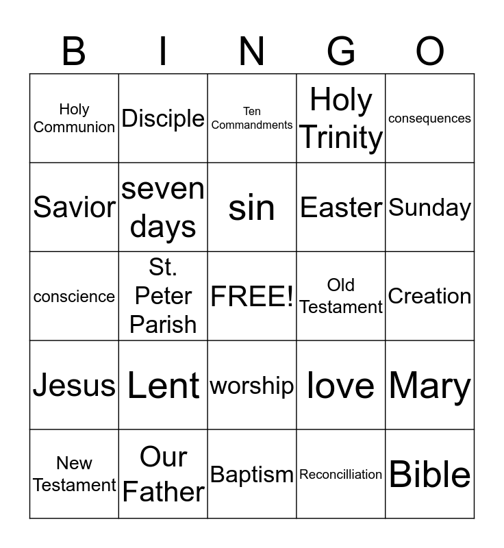 This bingo card has a free space and 24 words: Lent, Our Father, sin, New Testament, consequences, Holy Communion, Savior, Disciple, Old Testament, worship, Easter, conscience, love, Mary, seven days, Reconcilliation, Creation, Ten Commandments, Sunday, St. Peter Parish, Bible, Jesus, Holy Trinity and Baptism.